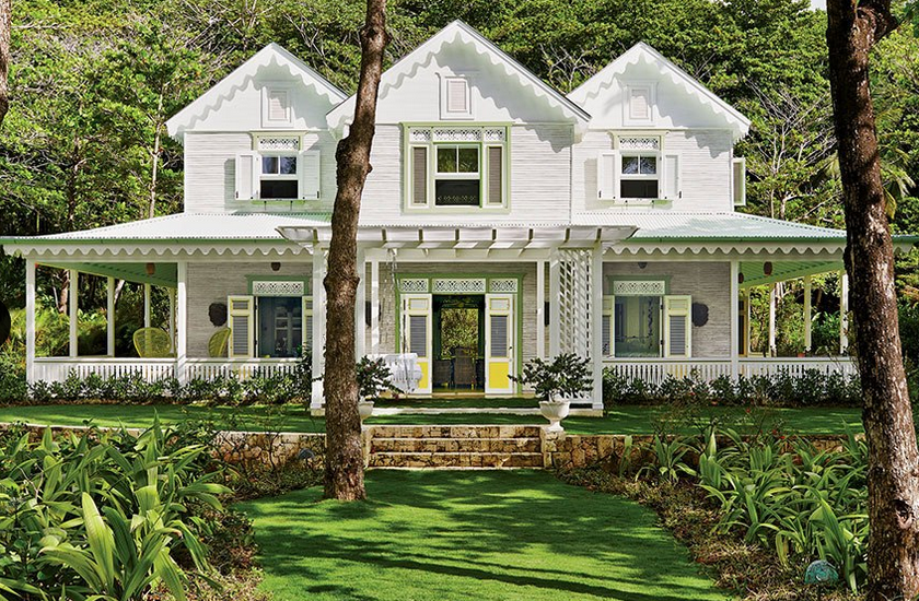 Ten years later, her own oceanfront home at the Playa Grande Beach Club named Casa Guava, a delicate "French Colonial" topped by a pale-green metal roof, gingerbread trimmings and porches. All of the fanciful fretwork was cut by an artisans hand.