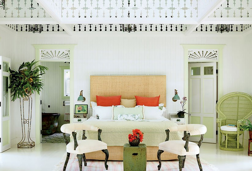 Latticework details play with the tropical light, splintering it into dappled patterns in the guest room. A fresh beautiful guest room to relax and dream in.